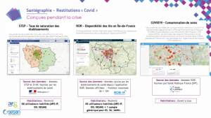 L’une des premières restitutions fut la conception d’une cartographie présentant en temps réel, la disponibilité en lits en soins critiques en IDF issue du ROR. Cette cartographie a été utilisée en cellule de crise à l’ARS-IF et a servi à la Cellule Bed Management pour suivre pas à pas, la saisie de ces disponibilités par les établissements de santé.